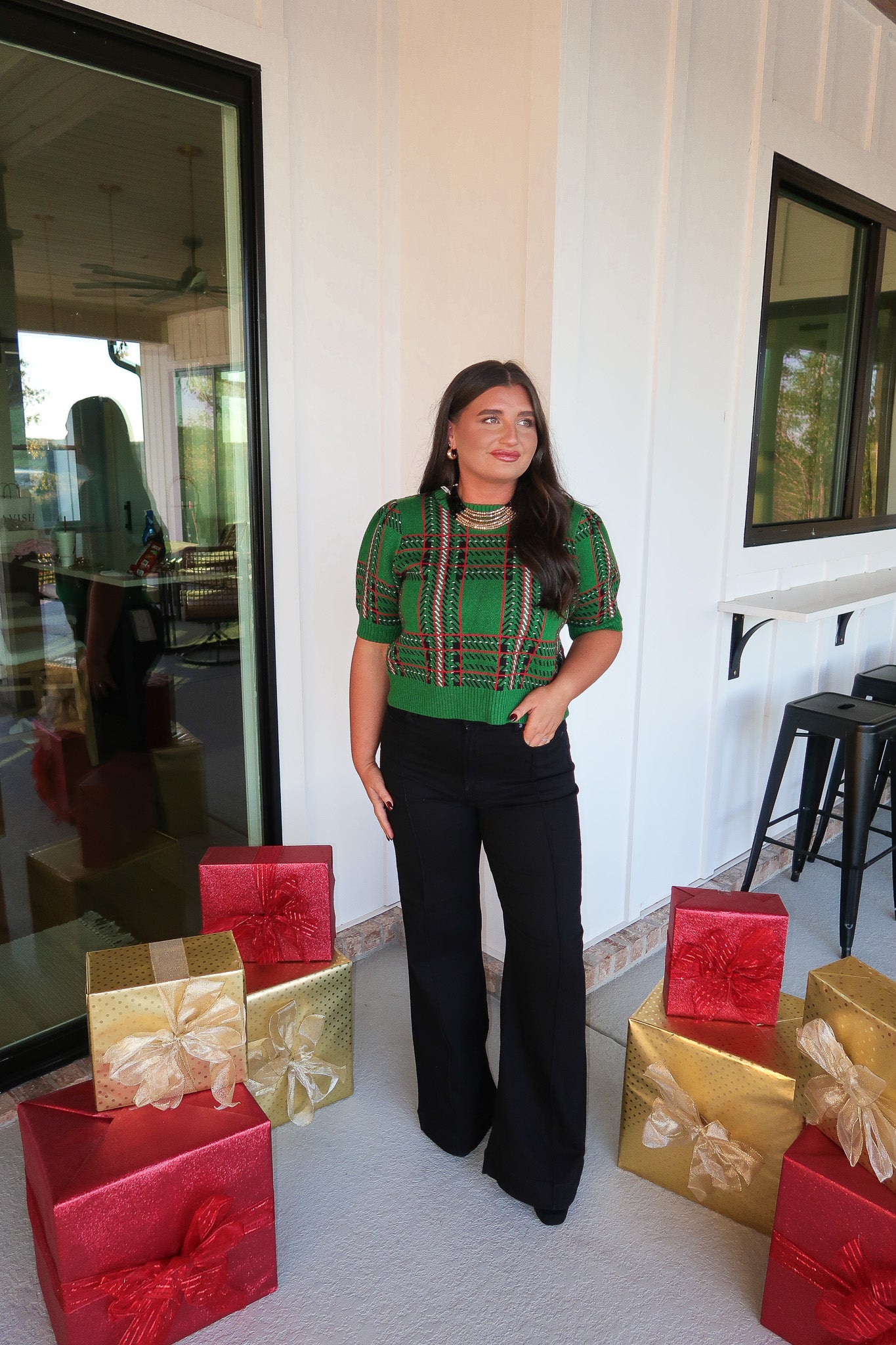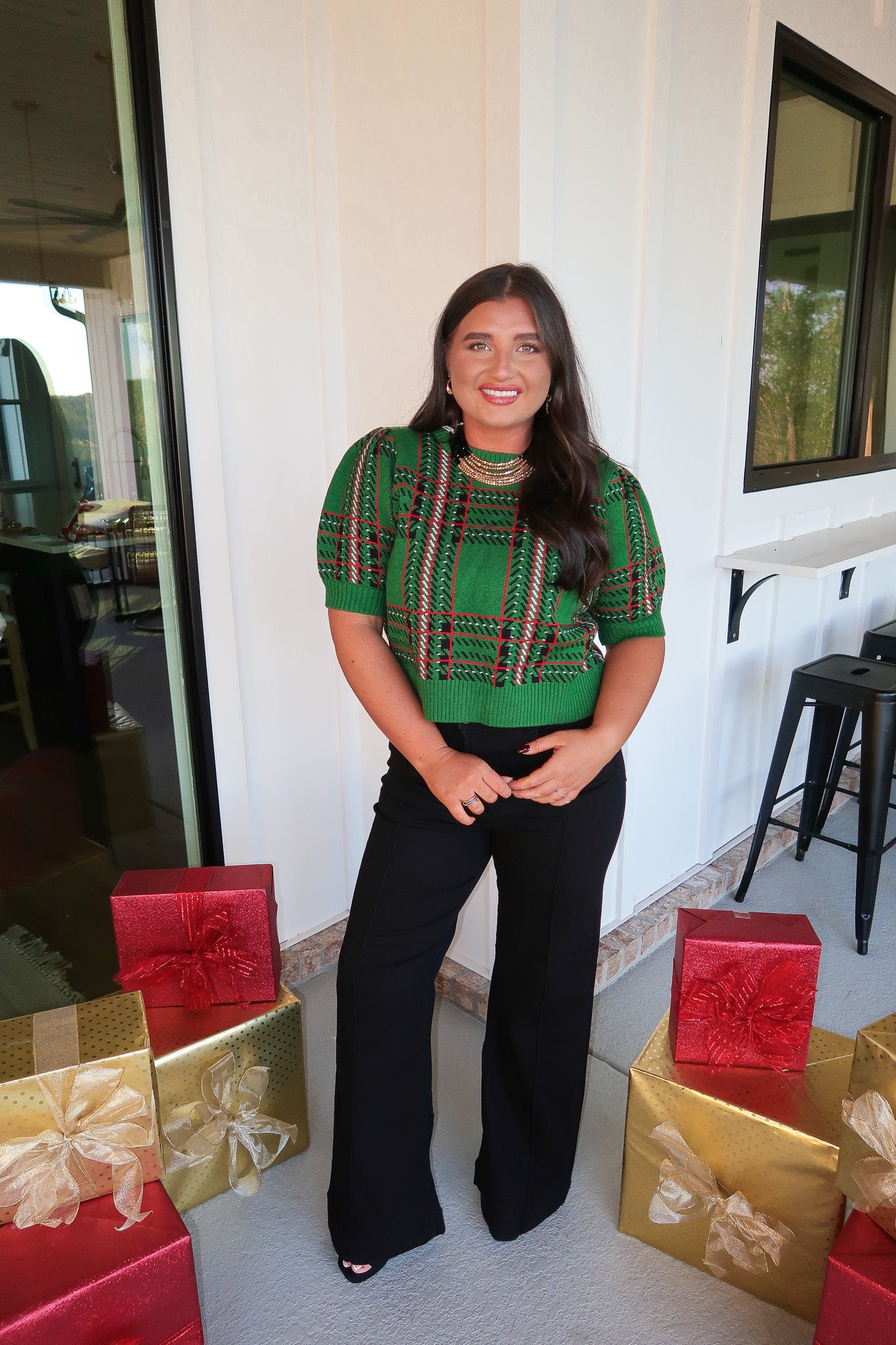 - Green bubble sleeve top with a red plain pattern throughout