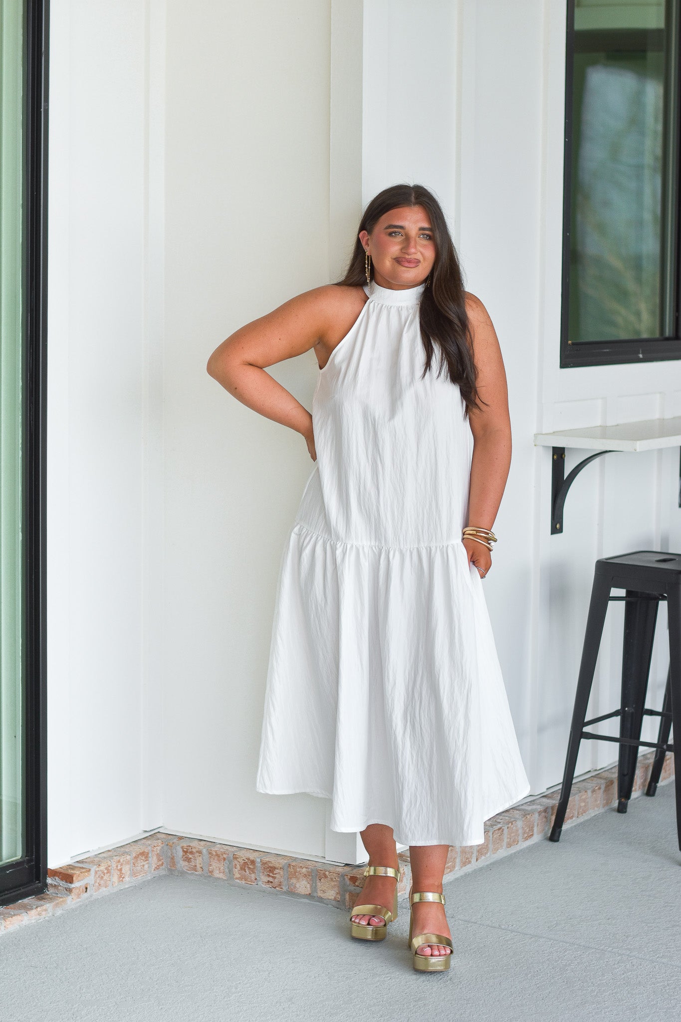 - White maxi dress featuring a halter neckline, with tie closure on the back