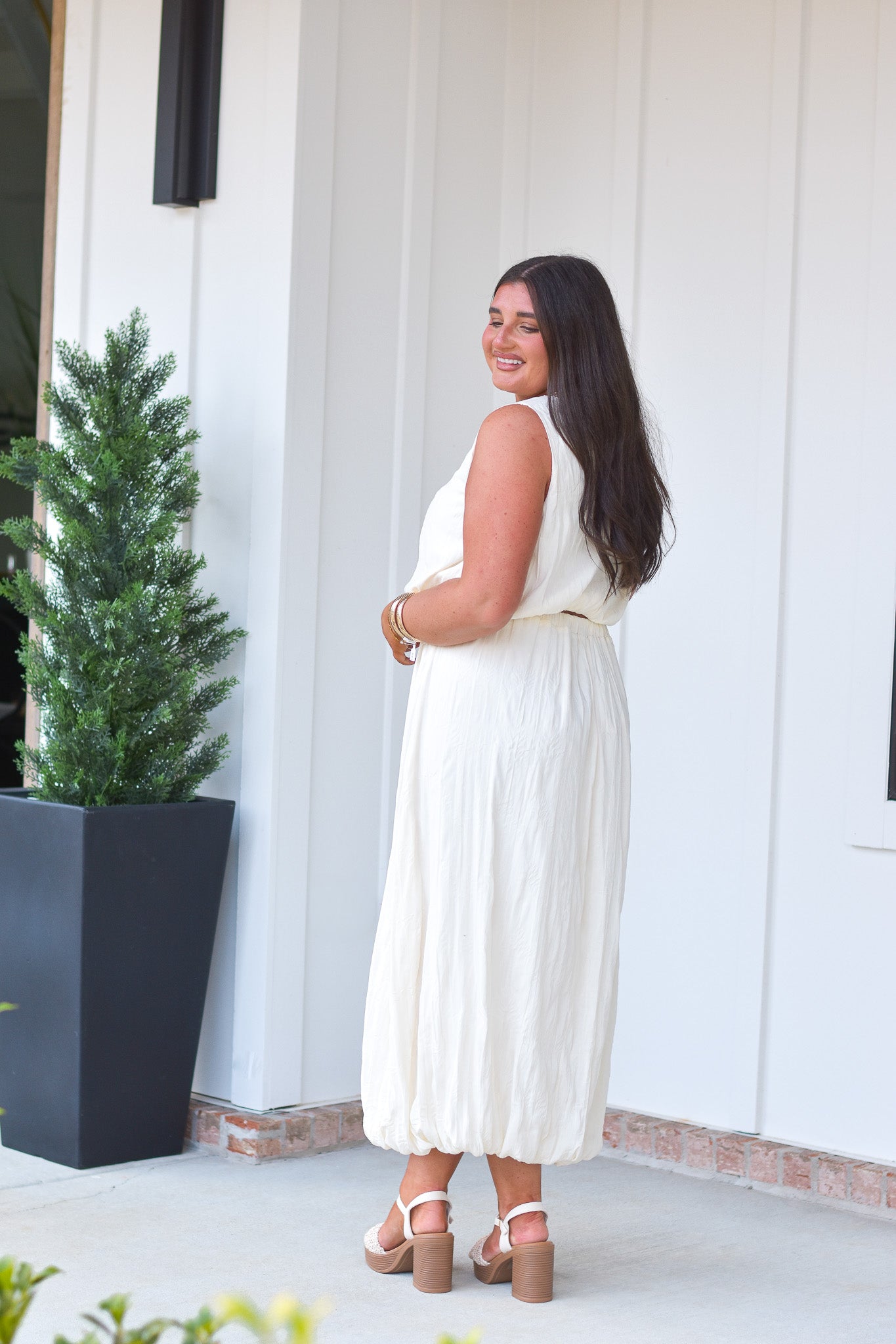 - Two piece cream set featuring a cropped tank and high-rise midi skirt
