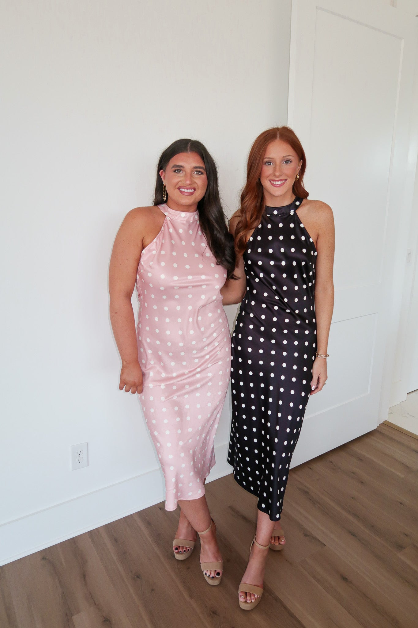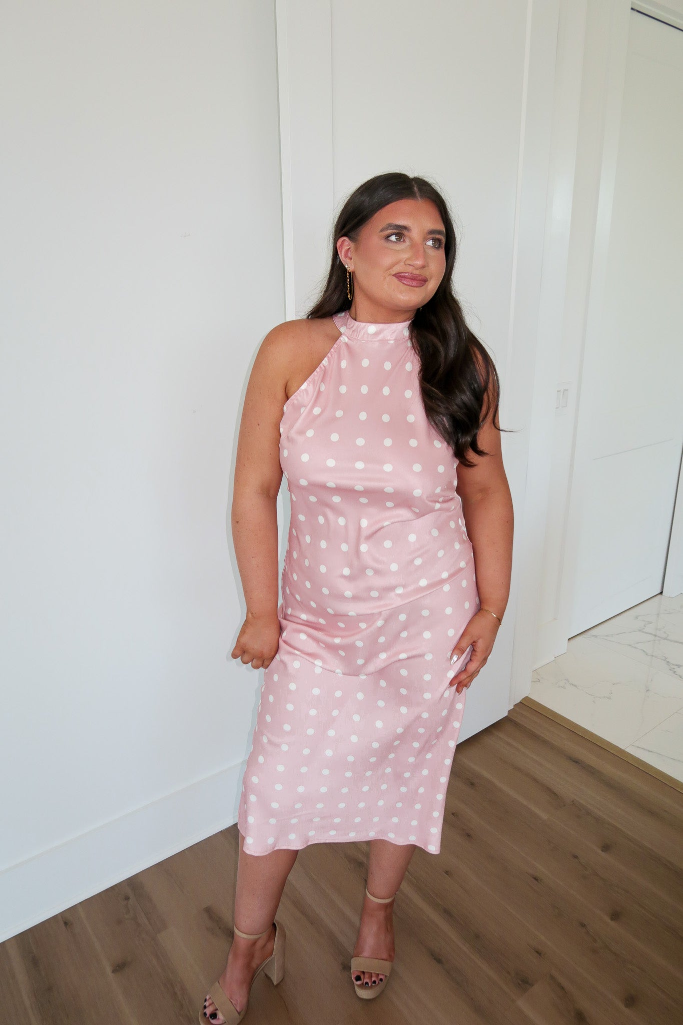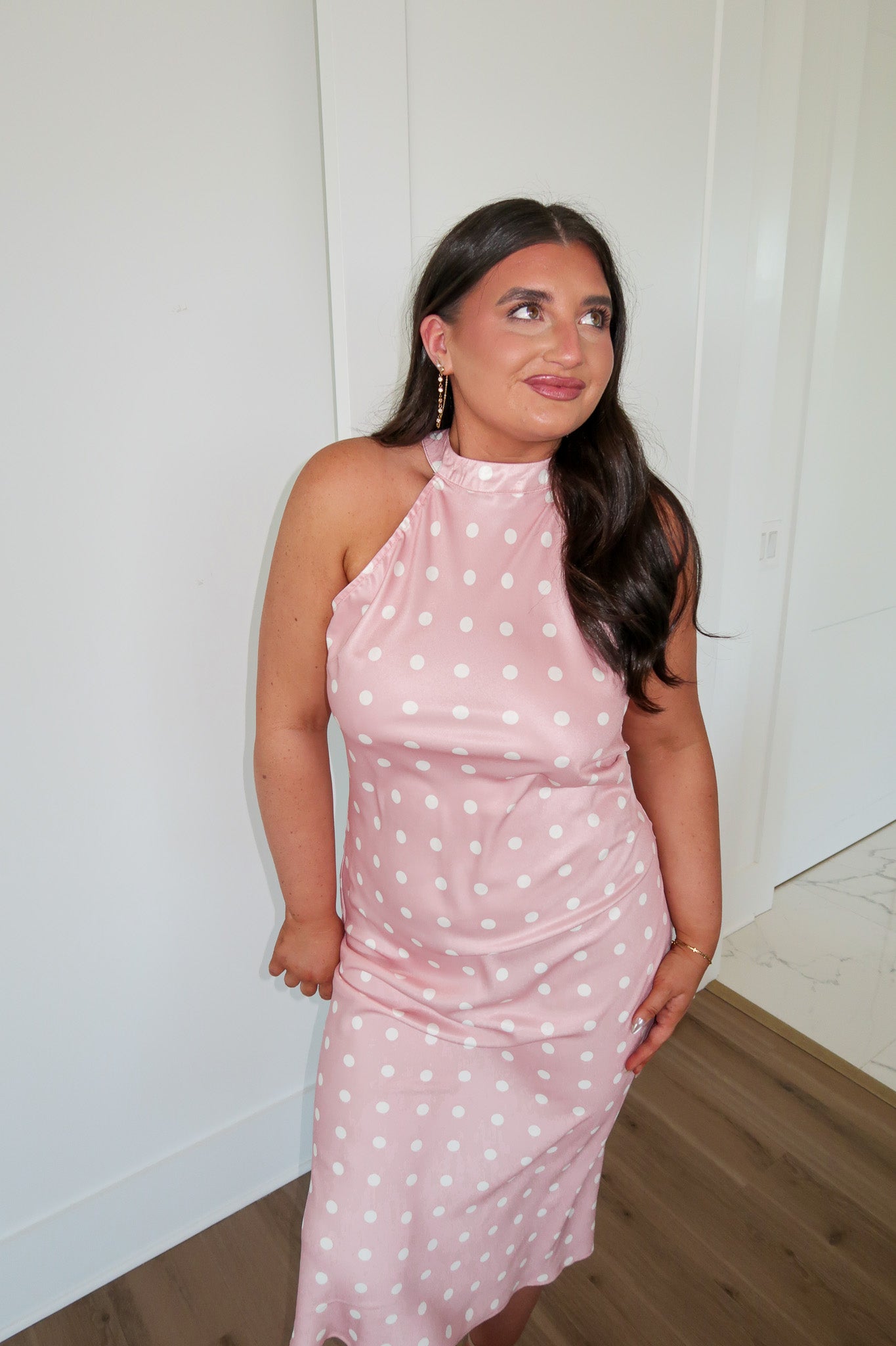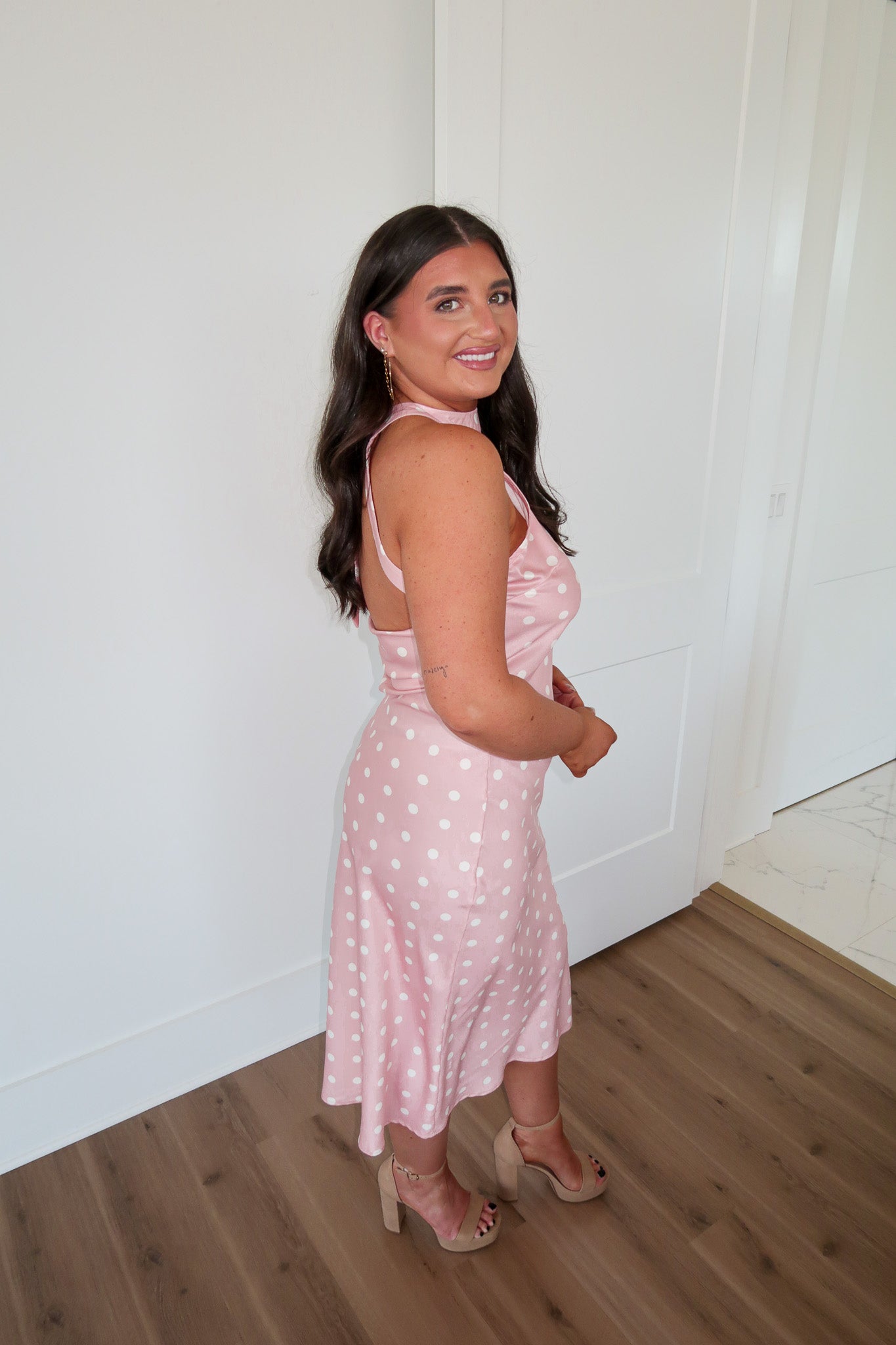 - Light pink satin dress featuring an ivory polka dot print throughout