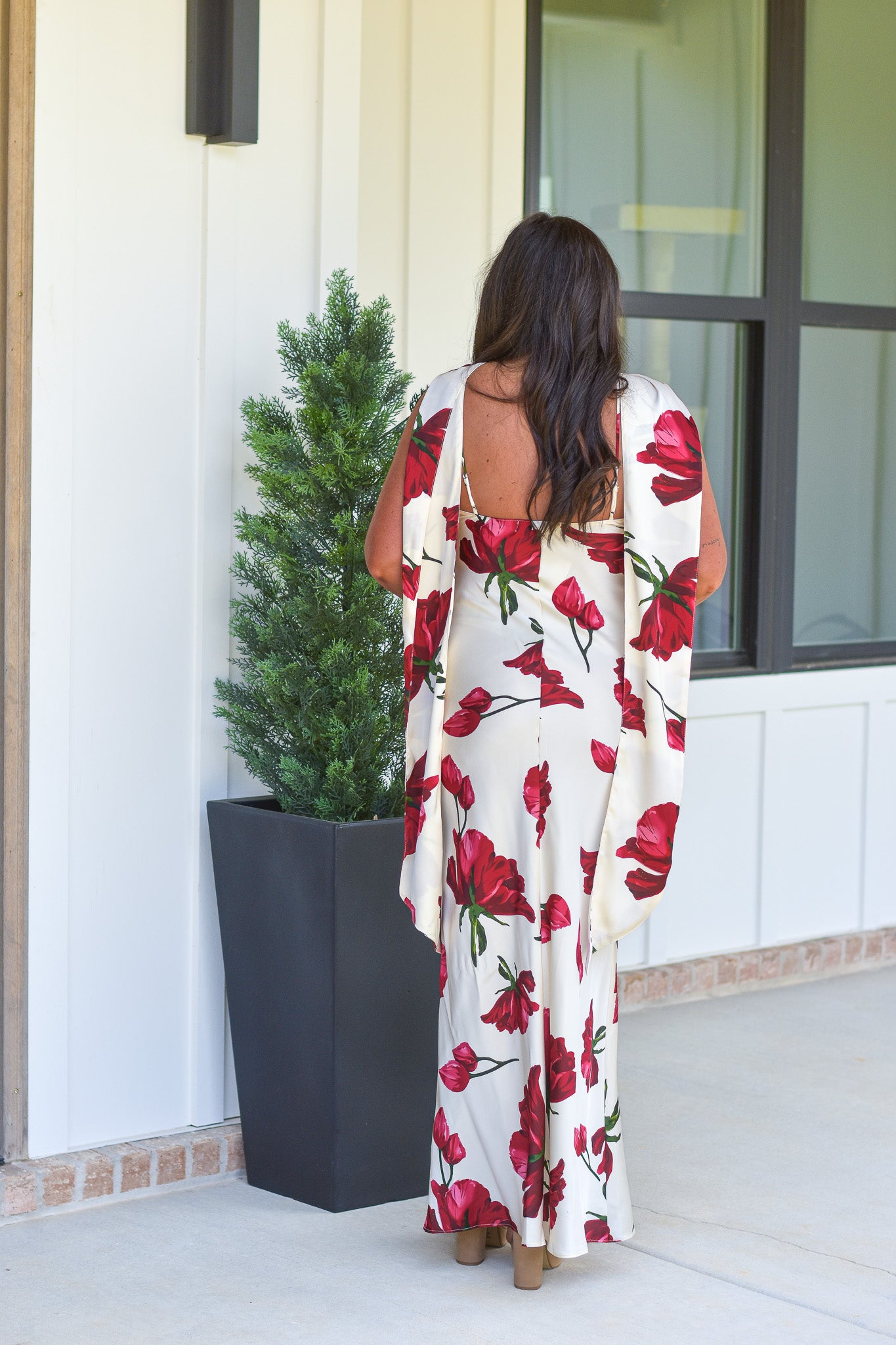 - Cream maxi dress featuring a red floral print throughout