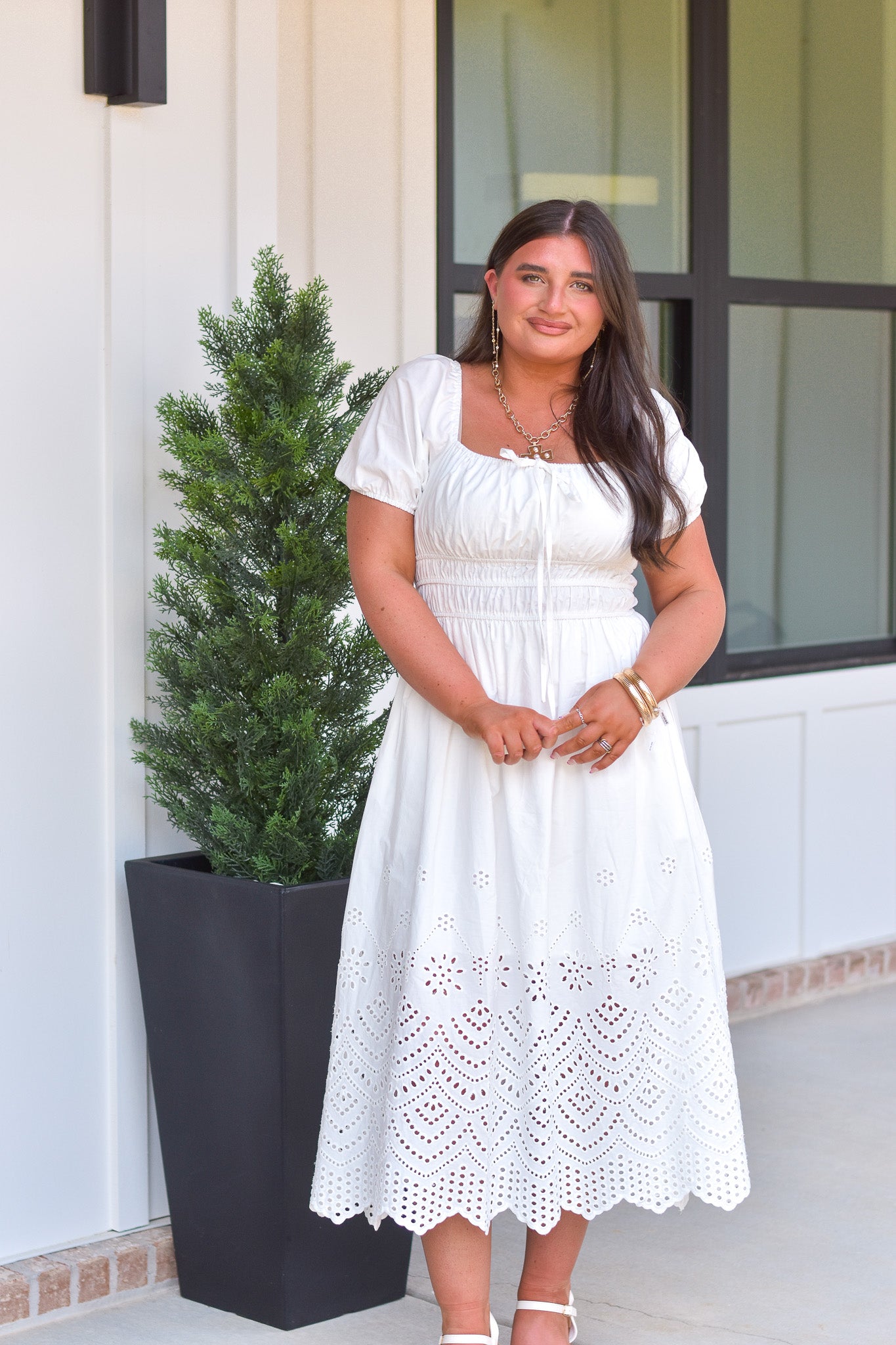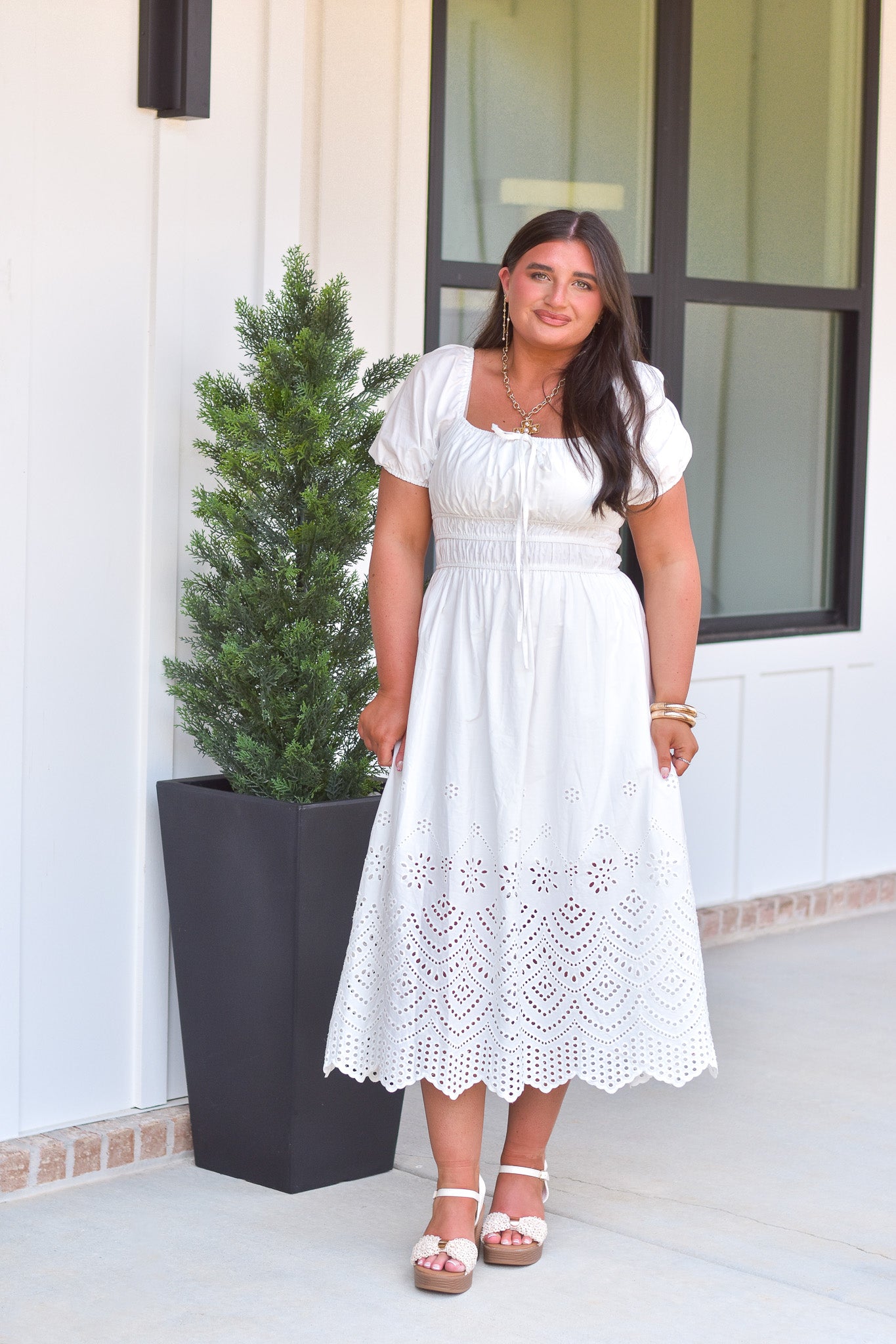 • White midi dress featuring gorgeous eyelet detailing throughout