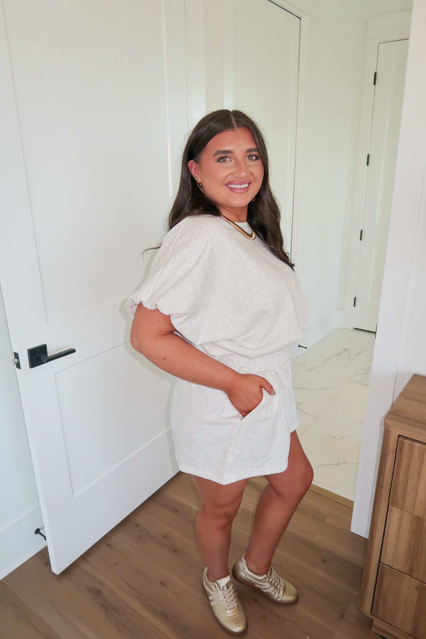 - Features a short sleeve, cropped bubble style top and high-rise shorts with a stretchy waistband and functional pockets