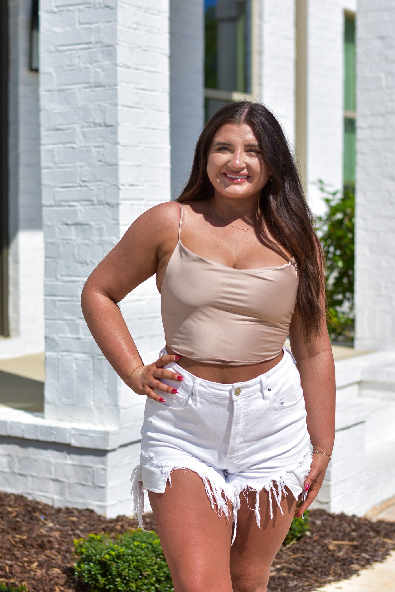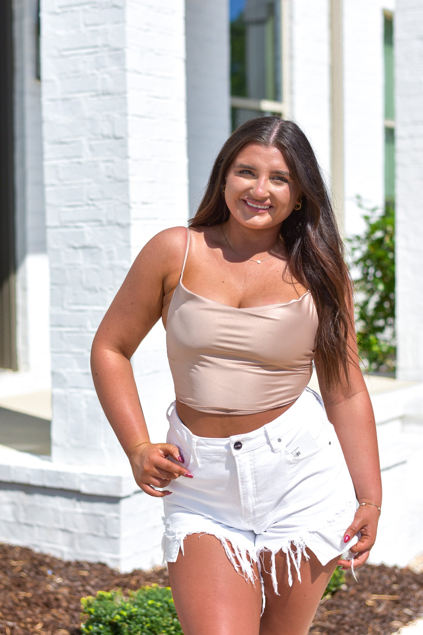 - Satin top featuring a cowl neckline and lace-up back detailing
